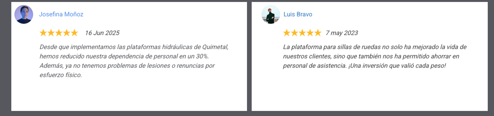 En Quimetal, sabemos que la eficiencia y la rentabilidad son claves para tu negocio. Nuestras plataformas hidráulicas están diseñadas para reducir el esfuerzo manual, permitiendo que una sola persona realice tareas que antes requerían de varios empleados. Esto no solo te ayuda a ahorrar en sueldos, sino que también reduce el riesgo de renuncias, lesiones o demandas laborales. Con nuestras soluciones, optimizas tus procesos, proteges a tu equipo y aumentas tu rentabilidad.